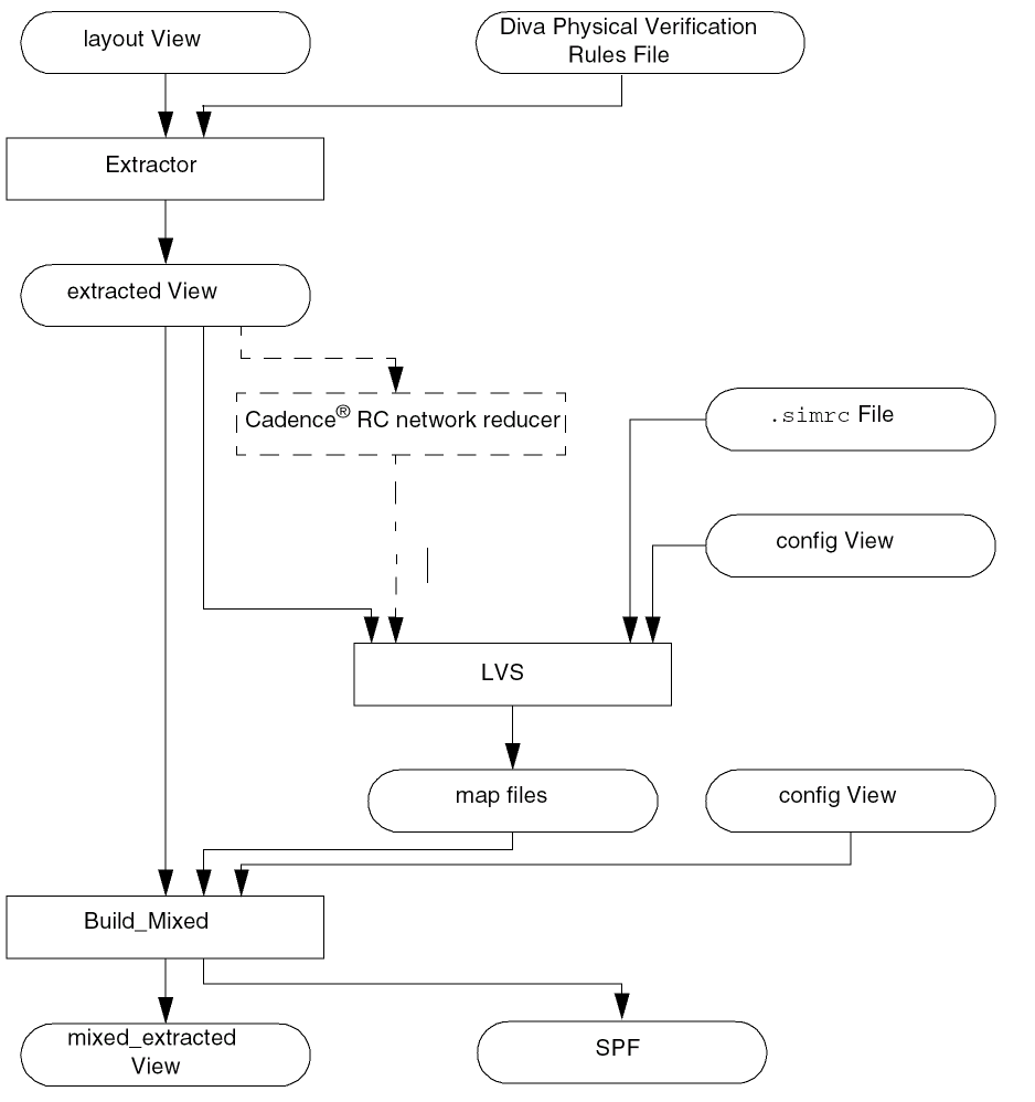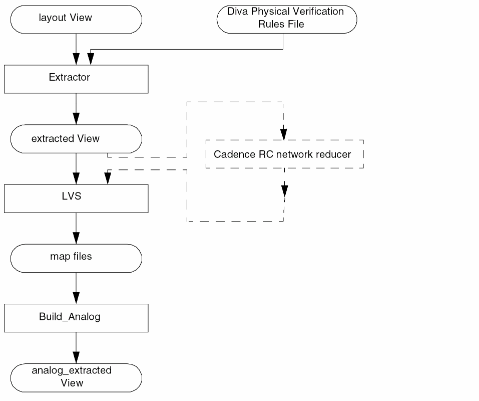 The following flow diagram illustrates the substeps in creating an analog_extracted view using the Diva® physical verification tool. The substeps for the Cadence RC network reducer are shown with dotted lines because they are optional.