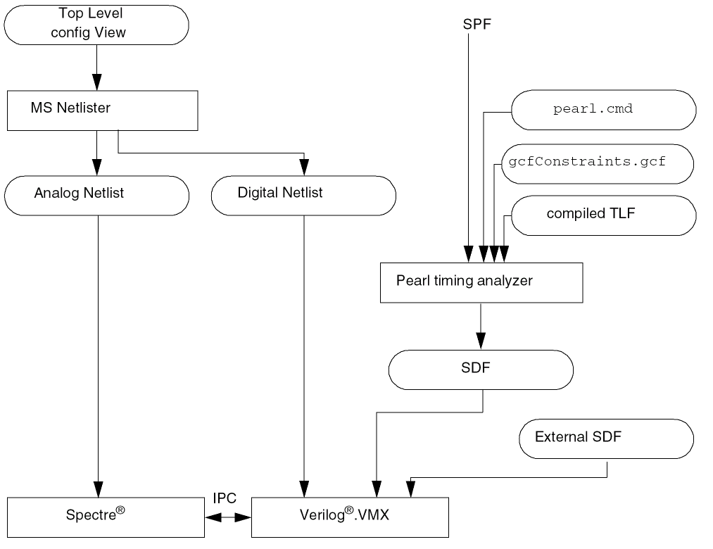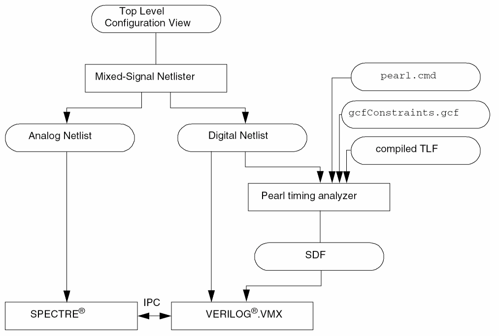 The build mixed process removes all digital parasitics and places them in the SPF file. The Pearl timing analyzer uses the SPF file to calculate the delays and generate an SDF file. The mixed_extracted view contains analog parasitics and analog and digital instances for netlisting and simulation.