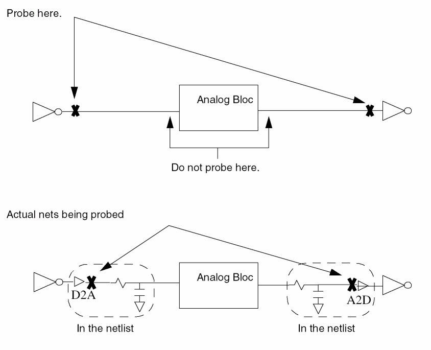 mixed_extractedview directly for analog and mixed nets.When you probe different types of signals (analog, digital, or mixed), keep in mind which nets exist in the mixed_extracted view. Probing a net or a terminal at a level of the schematic that does not have a simulation waveform causes a probing error.