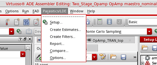 The Parasitics/LDE menu contains the following parasitic sub-menu options:- Setup (see Parasitics/LDE – Setup)