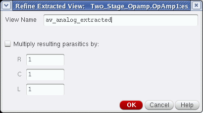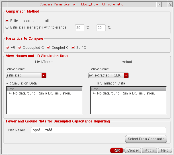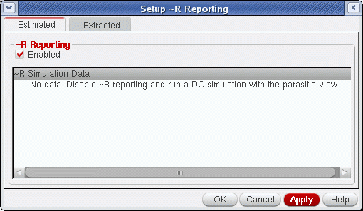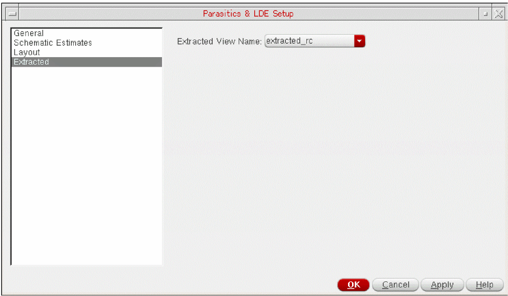 - Specify the estimated and extracted views to be used for parasitic comparisons and the ~R Simulation Data, if necessary (see also Simulation Data).