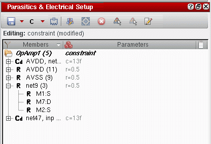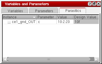 Virtuoso Parasitic Aware Design creates parasitic parameters in the Parasitics tab of the Variables and Parameters assistant (for information about this assistant, see the