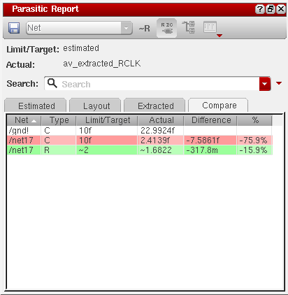 After layout is done, and has been extracted using Quantus QRC/RCX to create an extracted view, parasitic aware design can compare these parasitic estimates against the actual parasitic values, highlighting any parasitics that exceed their estimated values or differ from them by more than any optional specified tolerances. To achieve this you can control the comparison method which can treat estimates as either limits or targets, with a specified tolerance expressed as a percentage.