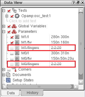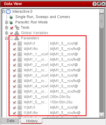 The top level expands to detail a list of tests that have been run (again this information is detailed in the Data assistant).If a single test is used to simulate both parasitic/LDE and extracted views, but only one view had one instance of the design in the test then you will have to simulate twice, changing the configuration in between (which is done using the Run Simulation assistant - see the Virtuoso ADE Explorer User Guide. This is so that the first simulation will be bound to the parasitic/LDE view, and the second bounded to the extracted view or vice versa.