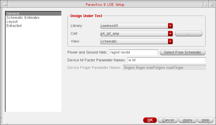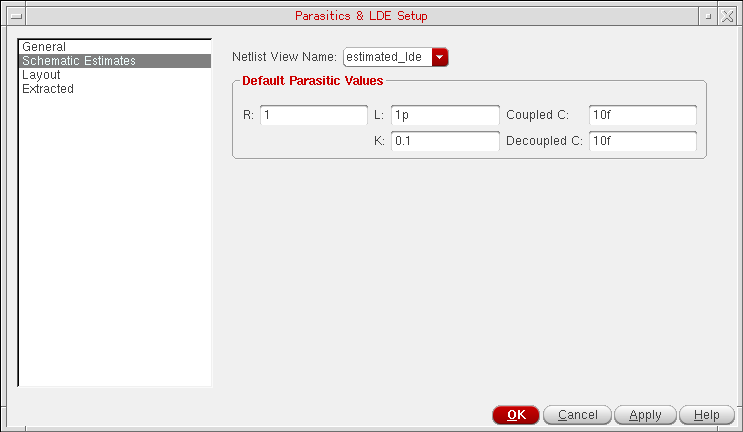 When Parasitics Mode is set to Schematic Estimates (Parasitics), the Setup Parasitics option will display the Setup form (Parasitics/LDE – Setup), and the Build Parasitic/LDE View button will become active. Selecting the Build Parasitic/LDE View button will display the Build Parasitic/LDE View form.