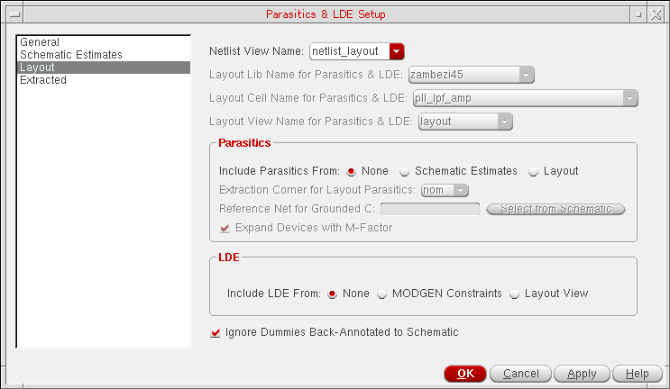 - When Parasitic/LDE Mode is set to Layout (Parasitics/LDE), depending on the setup in the Setup Parasitics and LDE form, one or more of the following are extracted from the layout or constraint view: