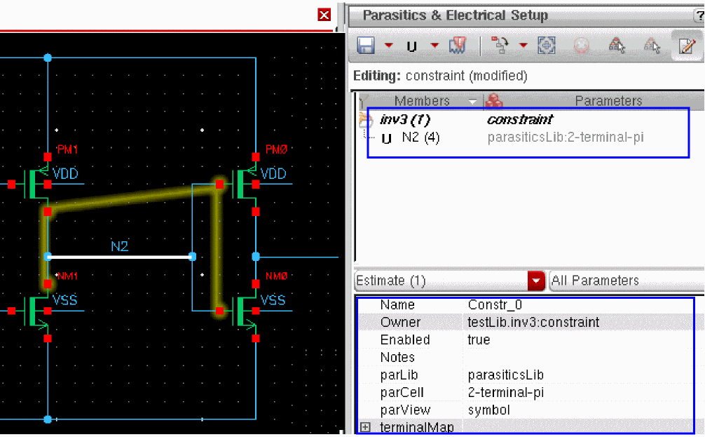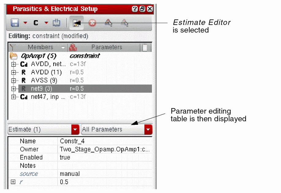 - Different parasitic estimates can be applied to different instances in the design of the same cell. This cannot be done by directly editing the schematic.