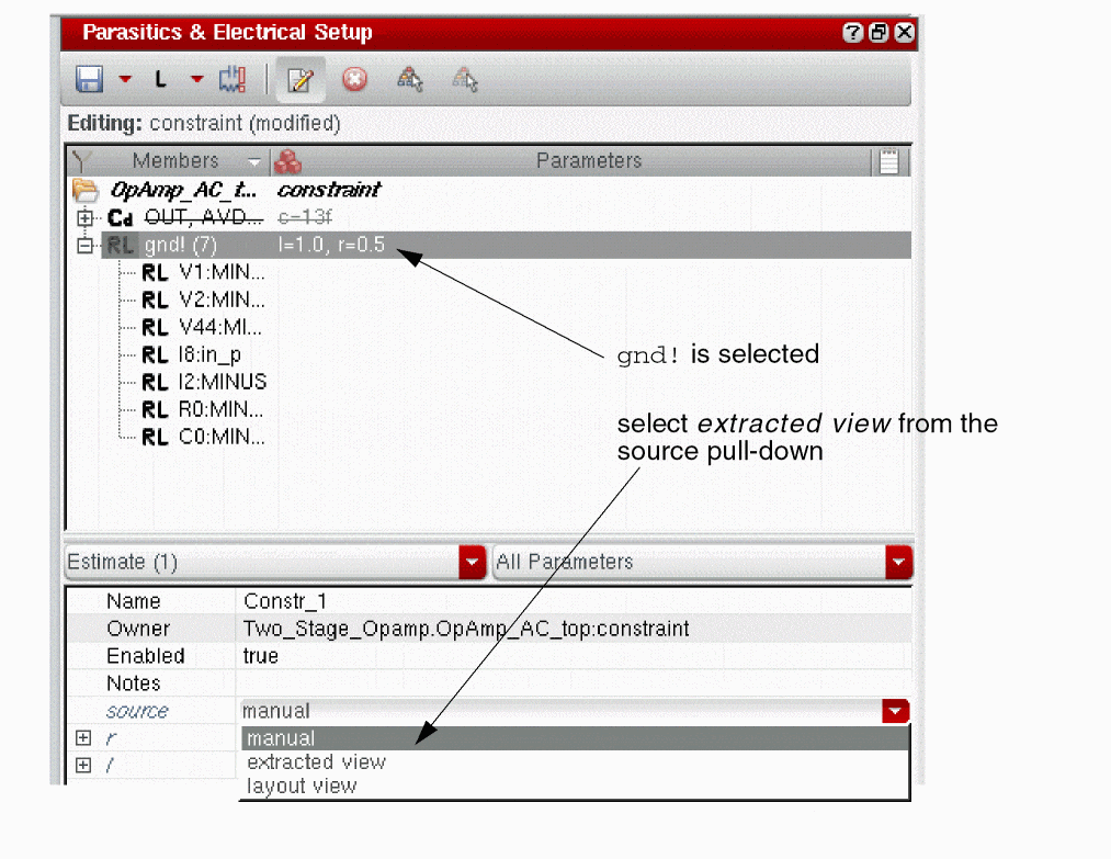 - Parasitic estimate functionality is available only from a configuration or a schematic view; it is not available form an extracted view.
