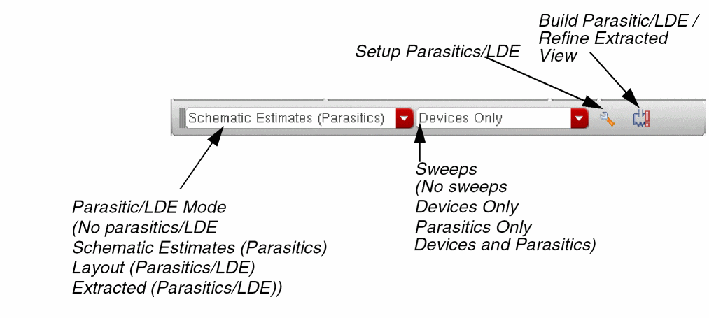 This toolbar can be used to simplify simulation with parasitic/LDE (estimated) or extracted parasitics. -