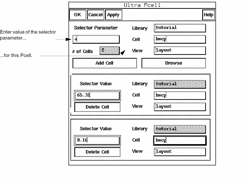 Library, Cell, and View are the library, cell, and view names of the final compiled ultra Pcell.
