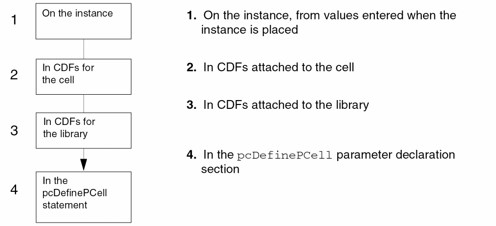 The values of parameters on a Pcell instance can be assigned in any of the following ways: