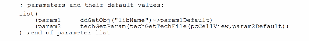 In the following example, the parameterswidth,length, andnumGatesare defined and assigned defaults:pcDefinePCell( list( ddGetObj( "pcellLib") "muxPcell" "layout") ; parameters and their optional default values: list( ( width “float” 1.0) ( length “float” 0.75) ( numGates “int” 1) ) ;end of parameter list