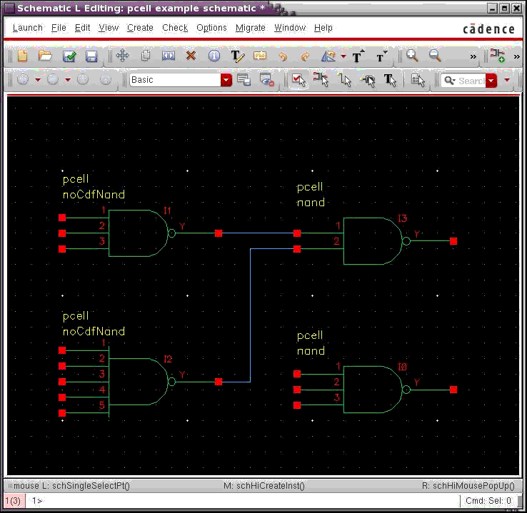 With Pcell symbols, it is possible to specify a variable number of terminals. The next figure shows the instances of variable inputs for the two nand Pcells.