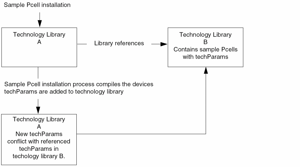 Installing sample parameterized cells in different technology libraries across the technology graph can lead to conflicts. When sample parameterized cells are installed, the technology database is updated with the parameters and values (techParams). These parameters and values must be unique within the technology graph. The following is an example of how conflicts can be created when installing parameterized cells in different technology libraries.