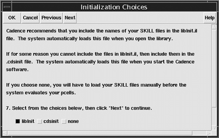 ChoosinglibInit.ilcreates a file in the library directory or adds additional information to an existinglibInit.ilfile. All applications read thelibInit.ilfile, which enables all applications and environments to evaluate the sample Pcells. For more information about thelibInit.ilfile, refer to “Loading Pcells from the libInit.il File”. -