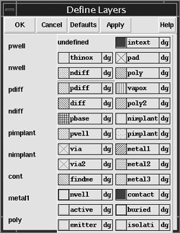 There are three columns in the Define Layers form. The first lists the name of the layers used in the SKILL code for the devices, the second lists the corresponding layer-purpose pairs, and the third lists whether the layers are required or optional. A cyclic field labeled undefined identifies layers not previously defined in the technology file of the chosen library. You must define layer-purpose pairs for all required layers before continuing. You can also use this form to modify previously defined layers of the technology file. The following is a description of the layers used in the Pcell code.
