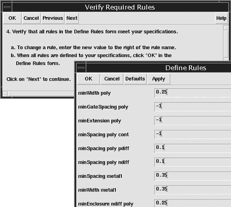 In the Define Rules form, any design rules that were not previously defined in the technology file default to