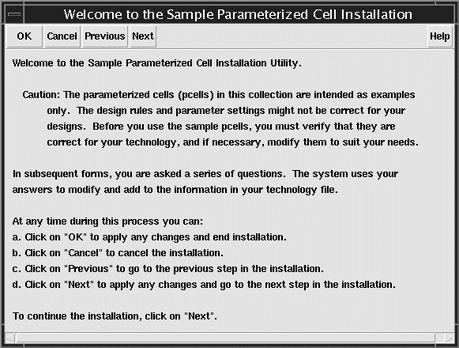 The Welcome to the Sample Parameterized Cell Installation form appears. Read the form before continuing.