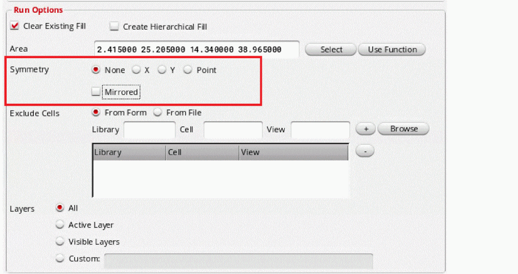 You can generate fill shapes in a user specified area based on specified symmetry value. You can specify the Symmetry options from the Run Options sections.