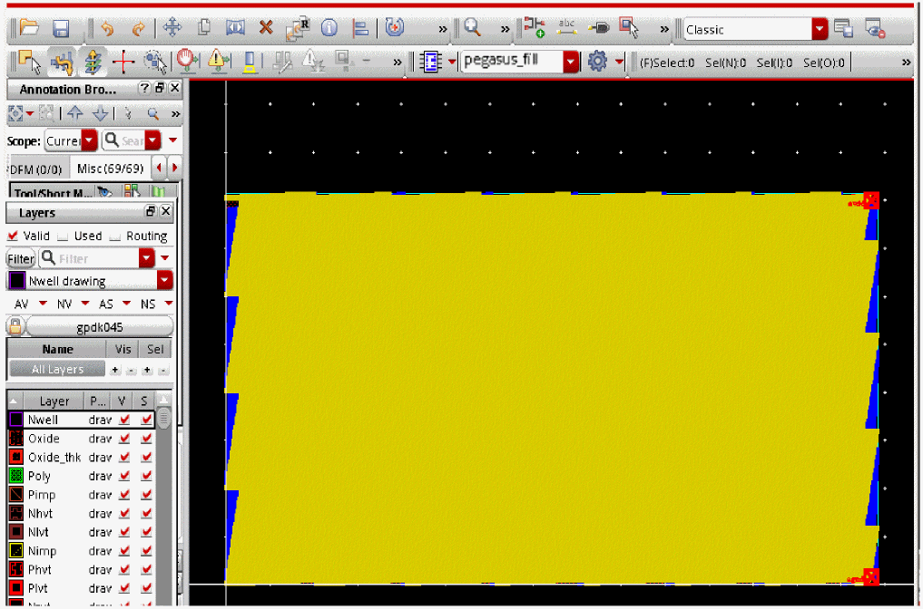 Click the Run Pegasus Interactive SignOff Fill icon. Virtuoso CIW prints the message: SignOff Fill is running…. Once the fill run is completed, Virtuoso CIW prints the message: SignOff Fill is finished successfully and dummy fills are shown on the layout canvas.