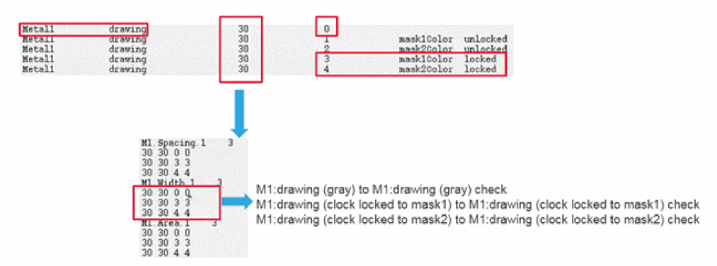 Following example shows three different rule captions: M1.Spacing.1, M1.Width.1, and M1.Area.1. There are also three layer check conditions: