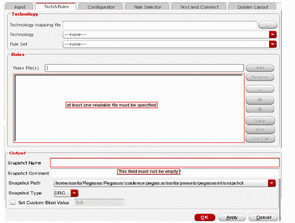 Assuming no technology is set up, Pegasus Interactive flags missing required inputs visually by boxing fields with the red highlight. Once the cursor hovers over the red-box, error message is displayed as a tooltip. Following example illustrates error dictated by the interface. Till required inputs are incomplete, GUI prevents you from creating a snapshot.
