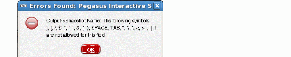 In the Snapshot Name field, you can enter the snapshot name. The naming syntax should not include any special characters, SPACE or TAB. If any special character is detected in the snapshot name input, following pop-up message box appears and requests you to modify the input.