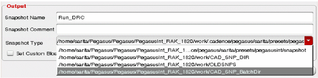 The Snapshot Path drop-down list allows you to set the directory path that snapshot is going to save to. The Snapshot Path field is set to the local snapshot directory by default. However, its drop-down items can be replaced through PegasusInt_SnapshotsDirs. If PegasusInt_SnapshotsDirs is specified, paths in this shell variable is parsed and stored as a list for the Snapshot Path combo field. The order of the snapshot directory path in this list is based on the order of declaration in PegasusInt_SnapshotsDirs. Thus, the active snapshot directory path is the first item in the list. Also, path declared in PegasusInt_SnapshotsDirs is expanded and displayed in its absolute path format.