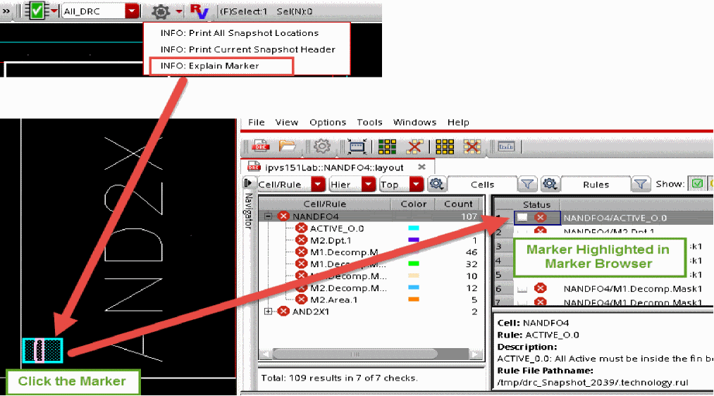The INFO: Explain Marker option allows you to select a marker in the layout viewer and that marker will then be highlighted in the Marker Browser window.