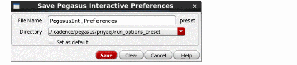 .cadence/pegasus/$USERdirectory and.cadence/pegasus/$USERat the$HOMEdirectory. However, its drop-down items can be expanded usingCDS_WORKAREAenvironment variable. - Set as default: Select this check box to save the settings as default.
