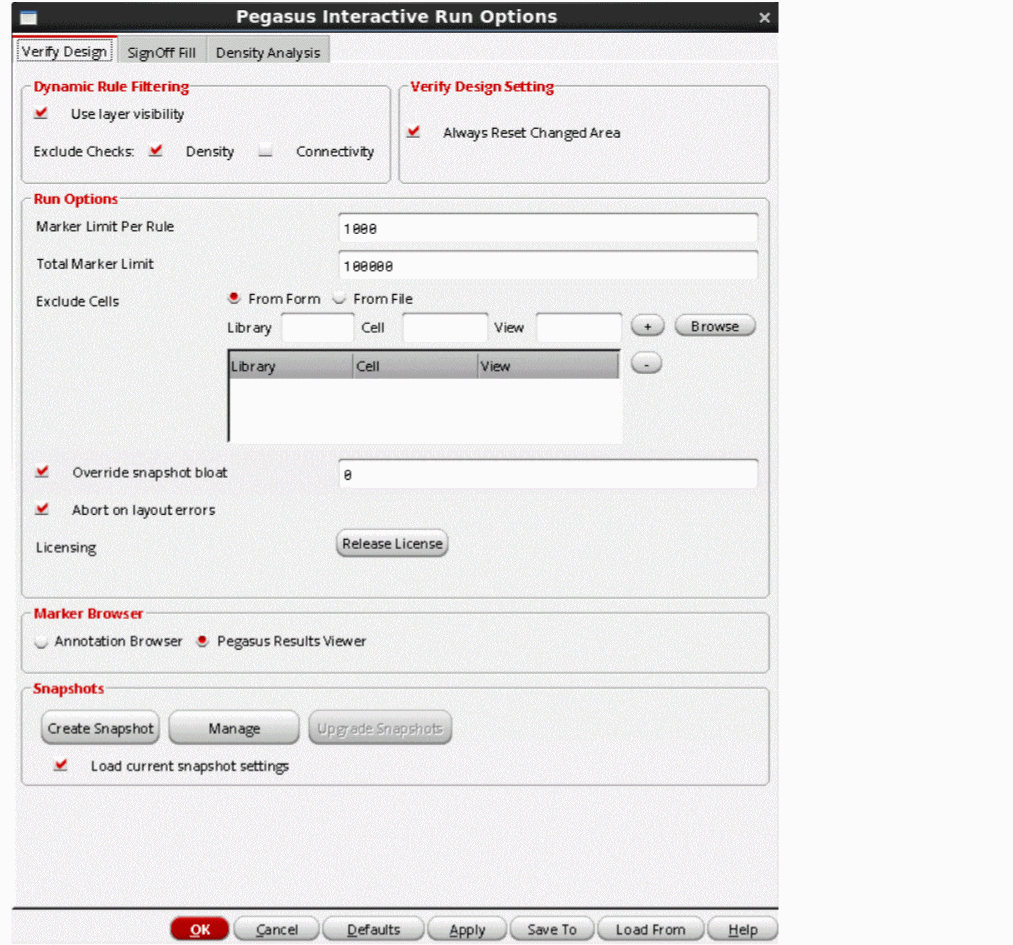 The Pegasus Interactive Run Options form contains three tabs: Verify Design, SignOff Fill and Density Analysis.