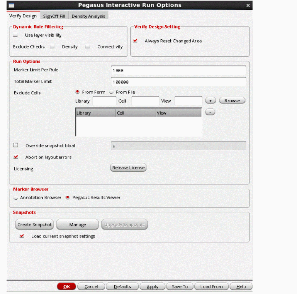 All options described in this section are applicable to entire Virtuoso session only, and are not window specific. If new layout is opened within the Virtuoso session, it will inherit settings set in the Pegasus Interactive Run Options form. Once Virtuoso session is closed, the options interactively set by you are not retained.
