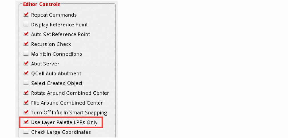 This option needs to be paired up with Virtuoso valid LPP utility. It can be set interactively through Layout Editor Options GUI. It is one of options under the Editor Controls field.