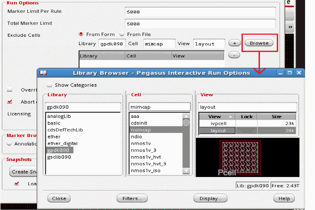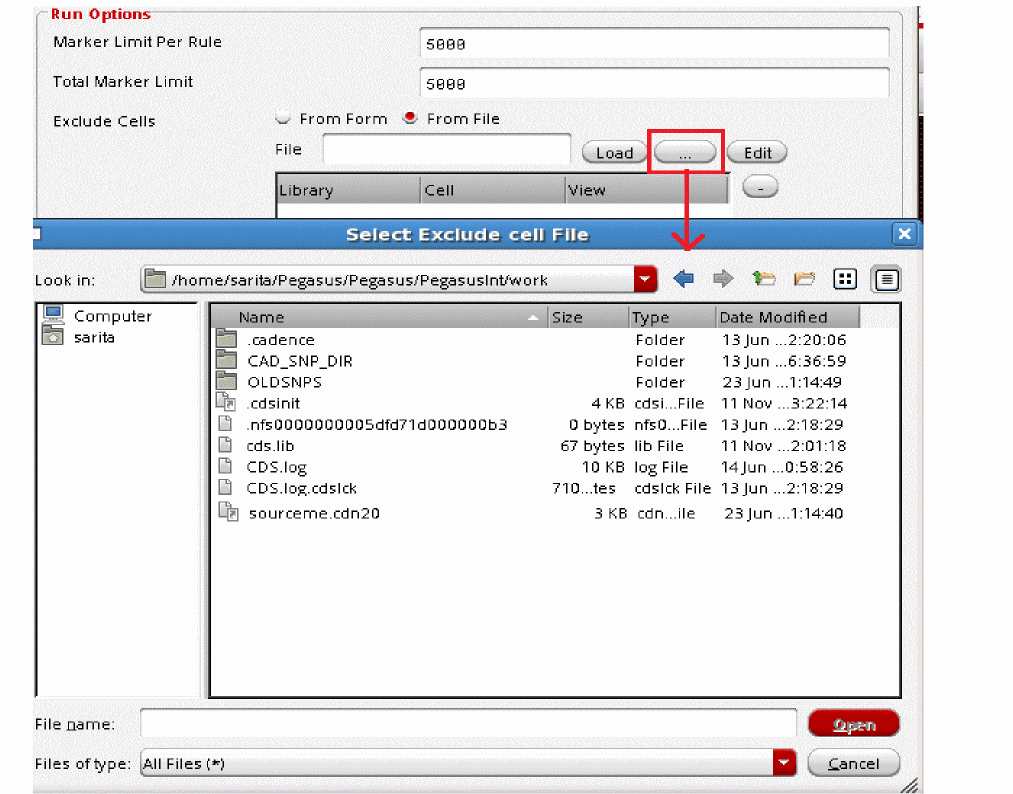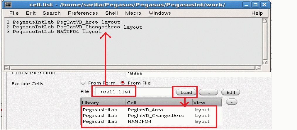 Correct syntax for cell declaration in the file should be in the order of library, cell and view and they are delimited by space between declarations. Also, you can declare wildcard, either ? or *, to conduct batch cell selection. Following example shows correct syntax declared in cell.list. Complete cell information is loaded into exclude cell table after clicking Load.