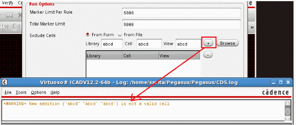 Commit the selection by clicking the plus sign (+) button. If the Information is insufficient, a warning message is issued in CIW. Following example shows entered cellview information is insufficient for Pegasus Interactive to process.