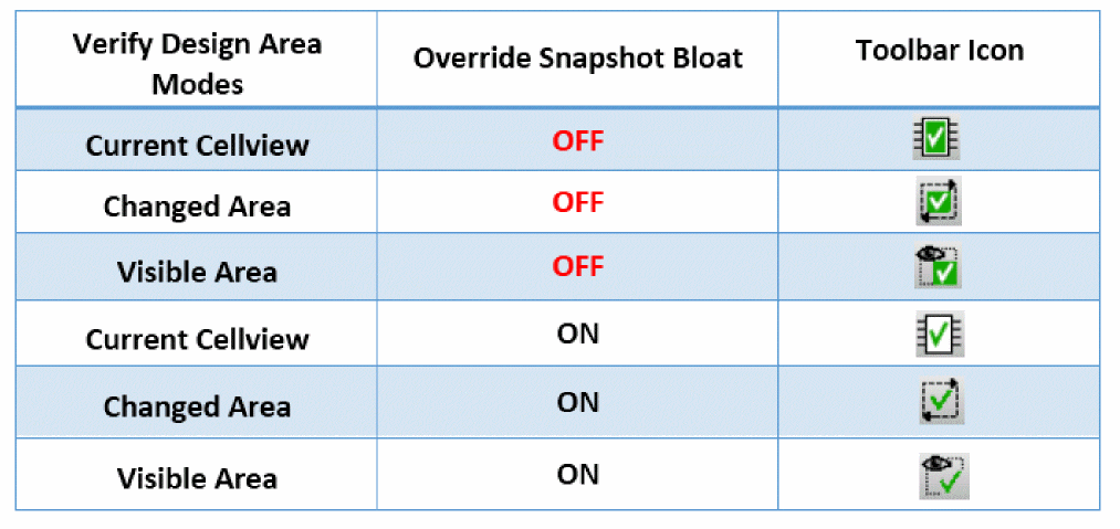 Also, enabling of Override snapshot bloat triggers the Verify Design icons update in the Pegasus Interactive toolbar for all of opened layout window: