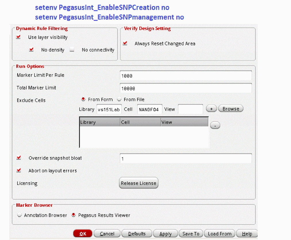 Since Pegasus Interactive retains last run result in an ascii format, you can reload this data any time by invoking Pegasus Results Viewer through the toolbar. On the contrary, you cannot view last run results via Annotation Browser on demand. For example, Pegasus Interactive’s latest run generates OA markers on the layout. You would like to first view results in Pegasus Results Viewer and then use Annotation Browser for DRC fixing afterward. In this case, error highlights are generated on the layout and errors are automatically reported in Pegasus Results Viewer when you toggle from Annotation Browser to Pegasus Results Viewer. However, OA markers are not restored once you toggle back to Annotation Browser from Pegasus Results Viewer.