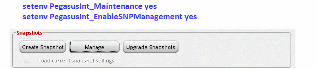 In this case, CAD wants a full control of snapshot creation and maintenance. Since users are not allowed to create local snapshot, snapshot creation trigger can be hidden through PegasusInt_EnableSNPCreation. Depending on the number of snapshot directories, CAD can decide whether to disable or enable Snapshots management field through PegasusInt_EnableSNPManagement.