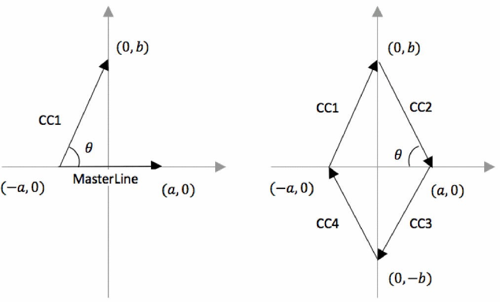When a polyCurve object is created using segmented curves, it is possible to apply a transformation to them. You can use this technique to create rhombus shapes by applying a transformation to a line segment. Rhombus curve segments can be created by generating a masterLine curve and then applying a proper transformation to create CC1, CC2, CC3, and CC4 as shown below.