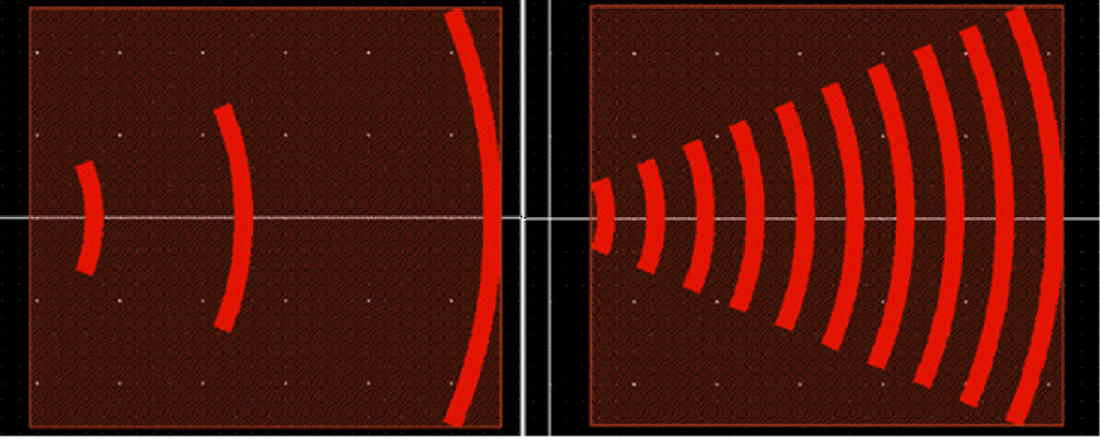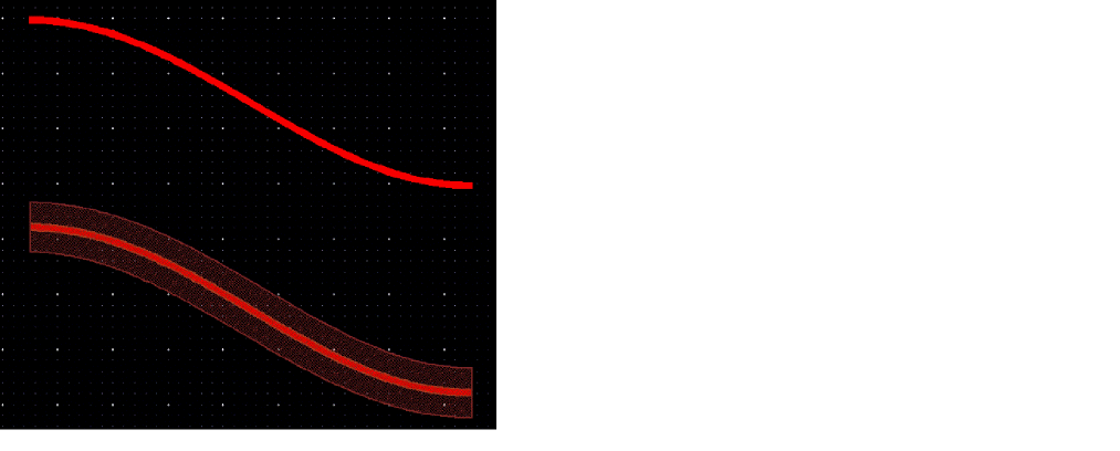 The following figure shows the S-bend generated on the design intent layer (top shape) and the same S-bend when its associated derived waveguide layers are generated (bottom shape).