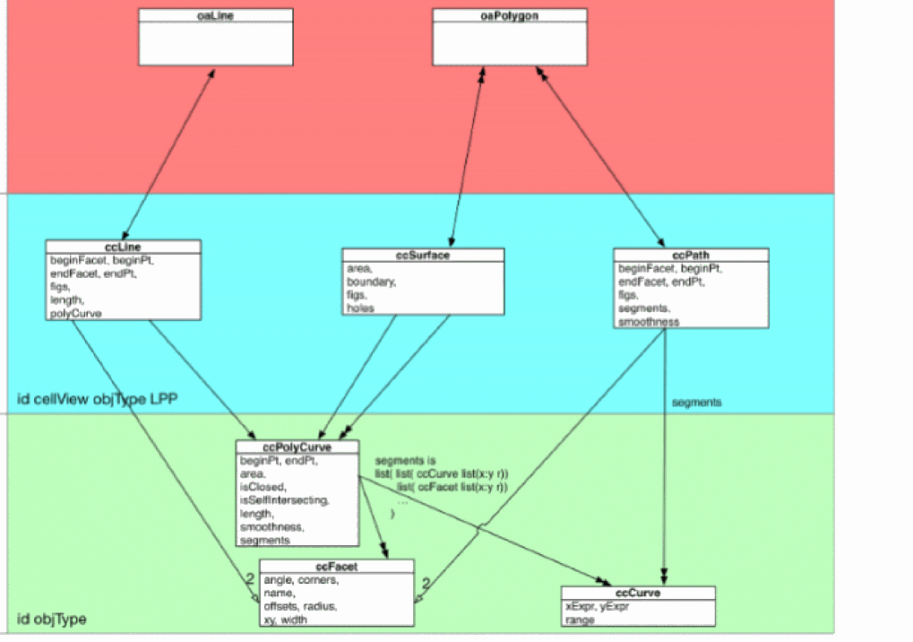 The physical layer or the OpenAccess level represents the manufactured polygons. These physical shapes have limitations in the number of vertexes. When a physical representation is generated for a ccFig, the algorithm takes into account the vertex number limitation and slices the figures appropriately, resulting in one (ccFig) to many (oaFigs) relationship.