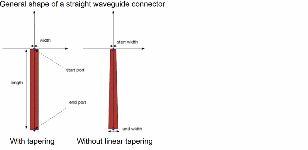A straight waveguide connector supports two type of straight connections, with tapering and without tapering. It further supports four types of tapering, linear, exponential, logarithmic, and parabolic. If tapering is enabled, you need to set the start and end width and also type of taper when you call the generator, otherwise, width specifies the default width of the straight waveguide. It also supports parameters such as start port and end port names.