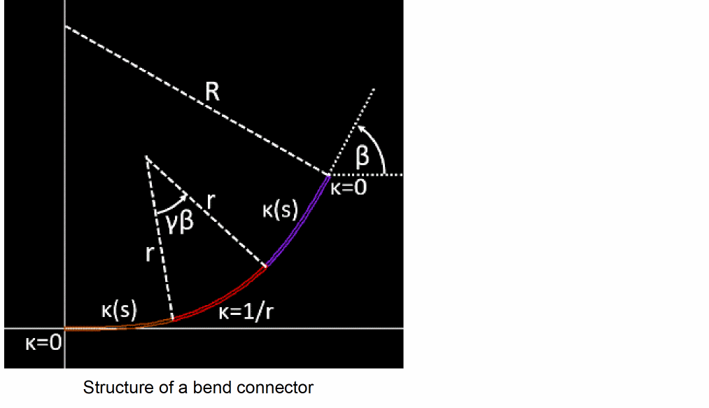 A bend connector connects two points on the same circle with angles equal to the angles of the tangents to that circle. The bend connector is described by the bend radius R of the circle and the bend angle of the arc of that circle. In its simplest form, a bend connector consists of a single circular arc segment. If the bend connector connects two straight waveguide segments with zero curvature k = 0, the curvature at the ports changes discontinuously, causing additional connection loss. This curvature discontinuity can be avoided if additional curve segments are inserted between the straight line segments and the circular arc segments so that the curvature becomes a continuous function k(s) of the arc length as shown in the following figure.