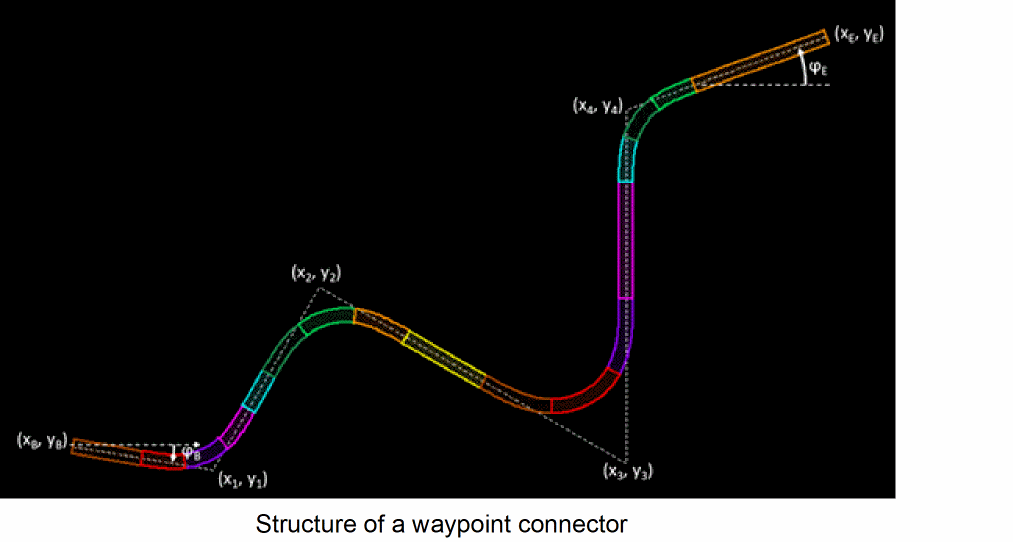 Similarly to a single bend connector, each bend connector in a waypoint connector can also consist of a circular arc connected to the straight lines at its ends by a pair of apex clothoids. This is also shown in the above figure, with the straight line segments, the circular arc segments, and the clothoid segments displayed in different colors. The waypoint connector can be calculated using the ccWaypointConnector SKILL function.
