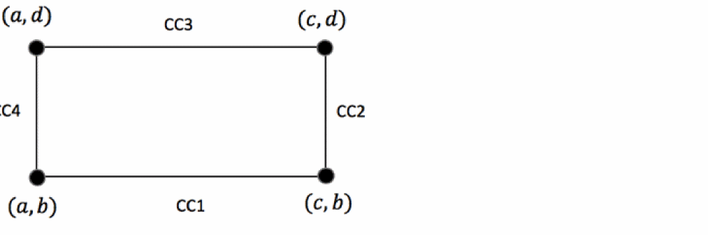 Here the bounding box of a rectangle, list(a:b c:d), generates ccCurve objects CC1, CC2, CC3, and CC4 representing the edges of the rectangle. You can use the ccCreatePolyCurve SKILL function to join these edges.