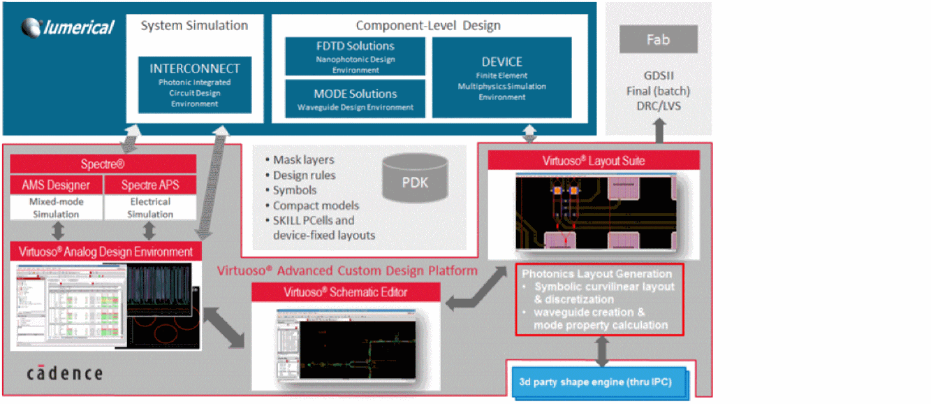 - Photonic circuit simulation in the Cadence® Virtuoso® Analog Design Environment, using Lumerical® INTERCONNECT®, a dedicated PIC simulation engine.