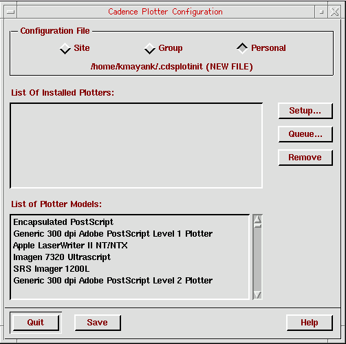 You must define the plotters in a Cadence plotter configuration file. If the X Window System or OpenWindows is running, you can save time by using the interactive plotconfig utility to define the plotters. If the X Window System or OpenWindows is not running, follow the procedures in the “Configuring the Plotter without the Utility” section of your plotter’s chapter.