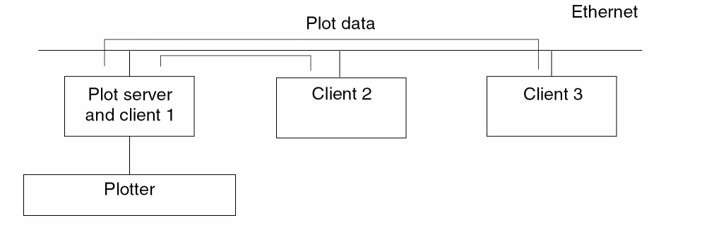 The plot server is the workstation to which the plotter is attached. The client workstation runs the design job using a Cadence application and a Cadence plotting product. A workstation with a plotter can be both a plot server and a client.