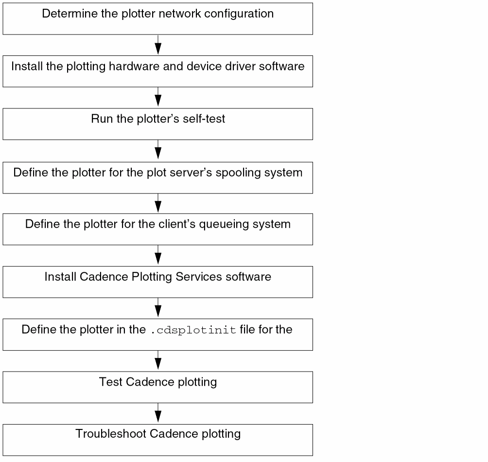 See the CalComp, HP, PostScript, Cadence standard raster driver, or Windows plot server chapter in this guide for more information about setting up the Cadence Plotting Services software for your plotter.