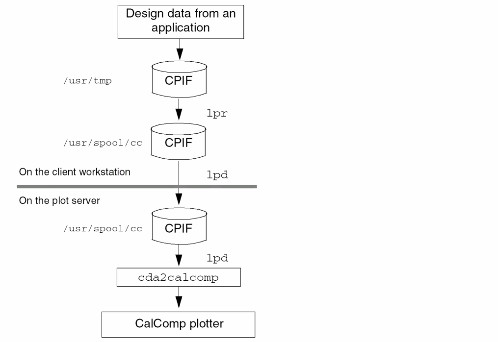 lpdprinter daemon moves the CPIF data from the client’s spool directory to the plot server’s spool directory,/usr/spool/cc. -